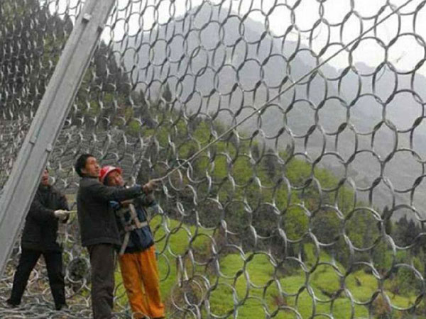结构配置:钢柱+支撑绳+拉锚绳+缝合绳+减压环[钢柱(间距9m),带消能环的∮18双支撑绳和∮16“人”字形上拉锚绳(每跨10个消能环),∮18侧拉锚绳(单绳),◇/08/120/4*4.5㎡钢丝绳网,∮8缝合绳,格栅网[支撑绳(c+)、锚杆(L+)]