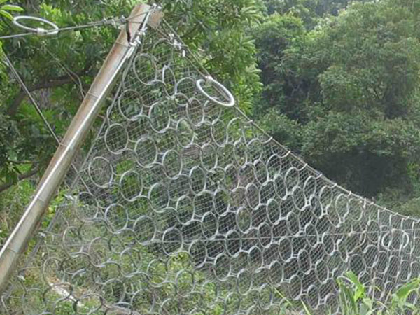 ROCCO环形网 型号:RX I-050 网型:R7/3/300 结构配置:钢柱+支撑绳+拉锚系统+缝合绳 主要防护功能:拦截撞击能500kj以内的落石